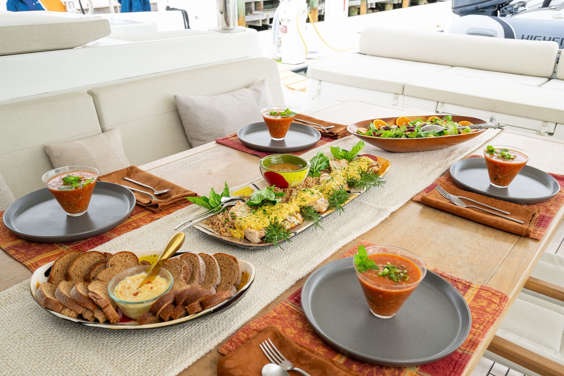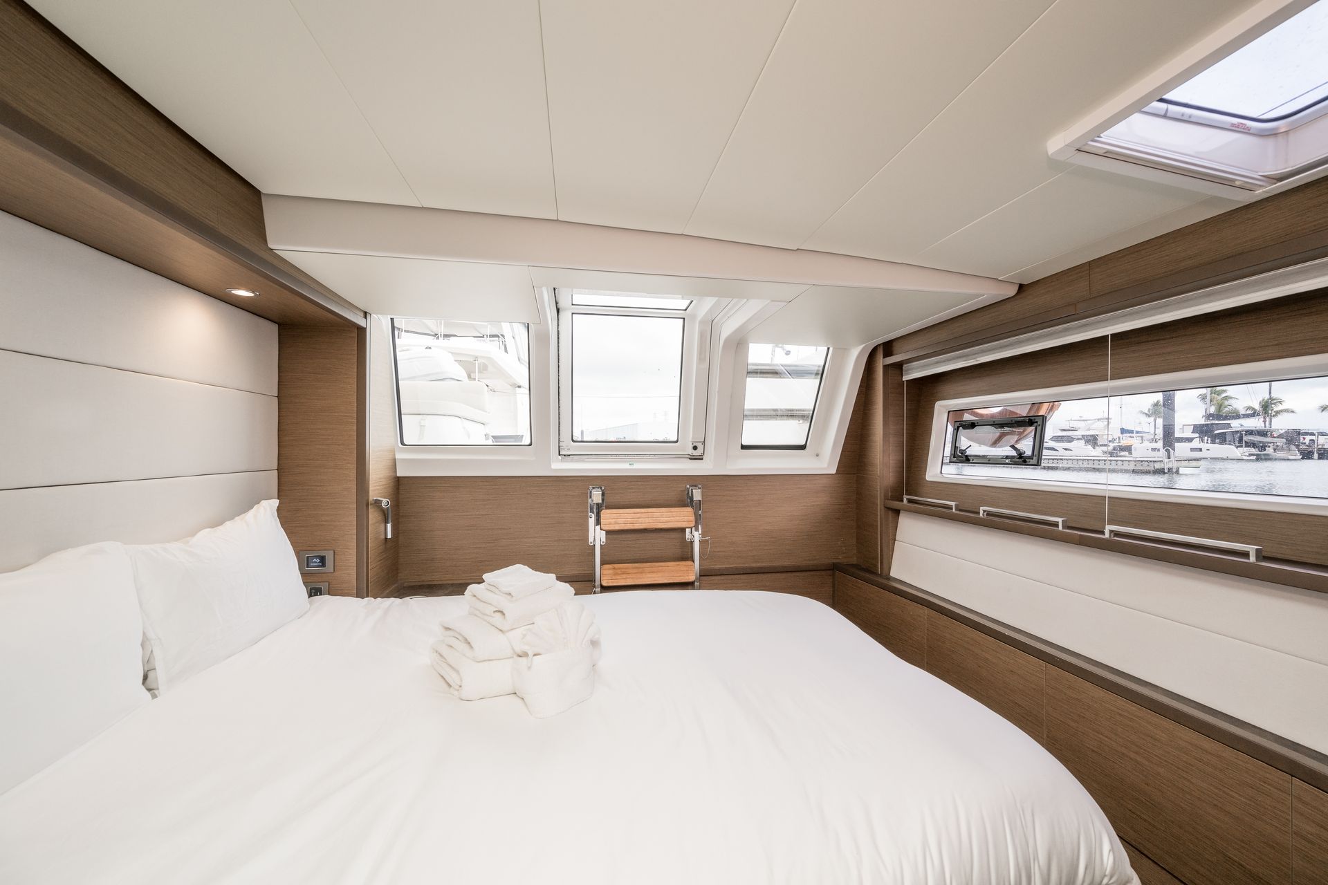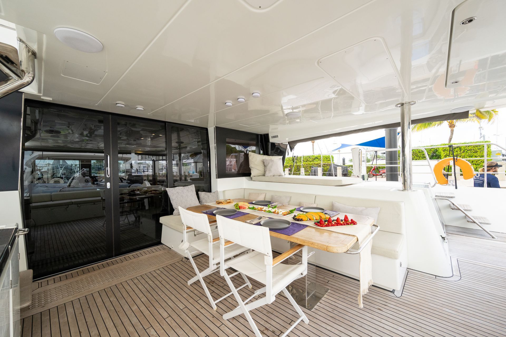 Atlantia boasts a spacious, fully equipped galley, with a large island, an industrial dishwasher, a new enhanced hood for the full sized range and oven, and a double bay sink. Her salon features a large retractable TV, a lounge/dining space with 2 convertible tables, and comfort beyond any other catamaran out on the water. The spacious all teak decks, lounge areas on her bow and stern provide ample space for a relaxing and luxurious charter. Atlantia’s outdoor accommodations are unmatched with two outdoor refrigerators, sinks, and an ice maker. Her helm is equipped with state of the art navigational equipment and cutting edge technology. This is the perfect yacht to entertain, and guarantees the most desirable experience on the water.